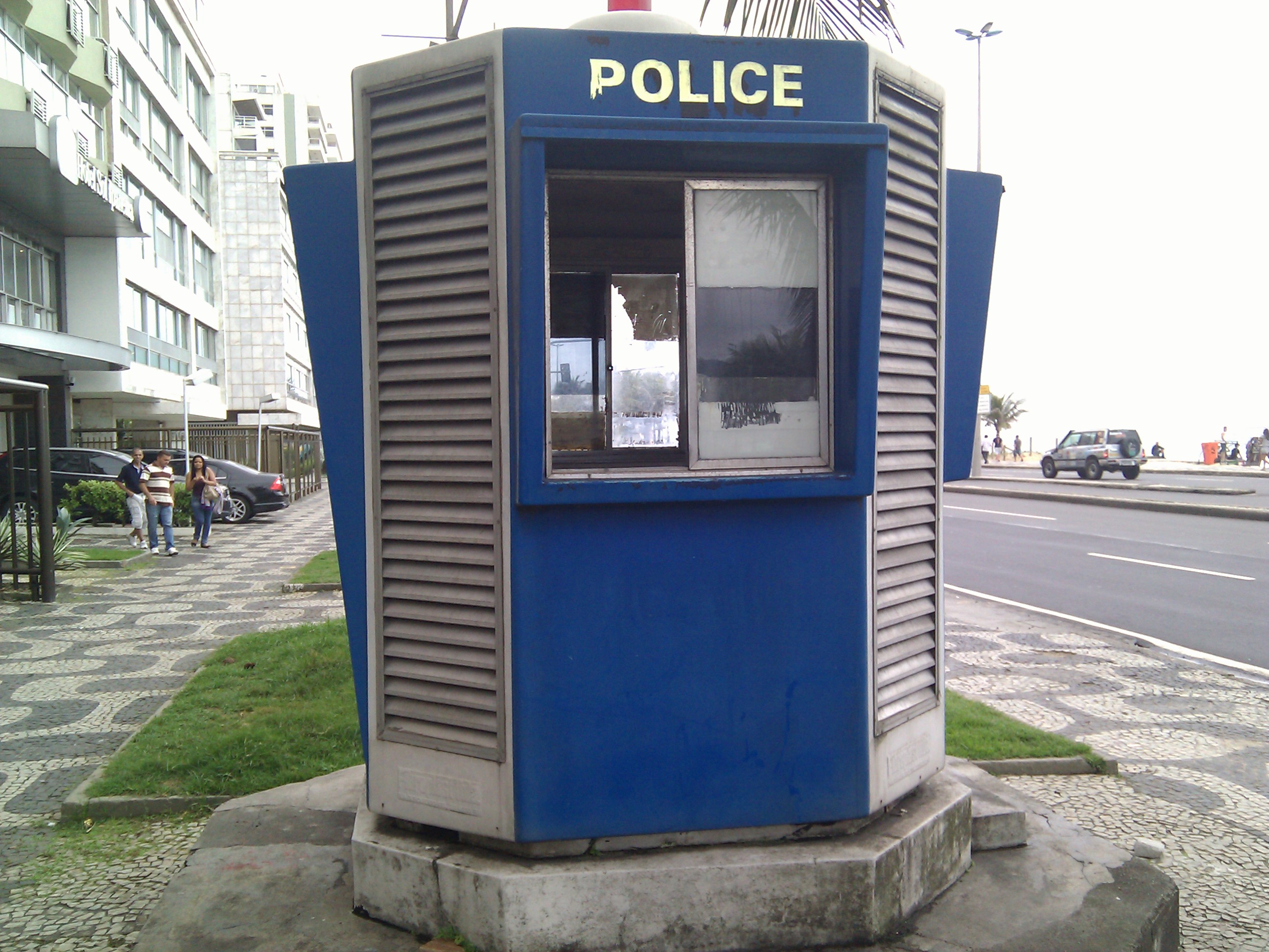 Este assim como outros tantos casebres transmitem falsa sensação de segurança. Melhor se eles não estivessem ali atrapalhando uma via de pedestres. Eu me pergunto se uma pessoa que conhece a cidade pensa poder obter ajuda em uma destas parafernalhas.