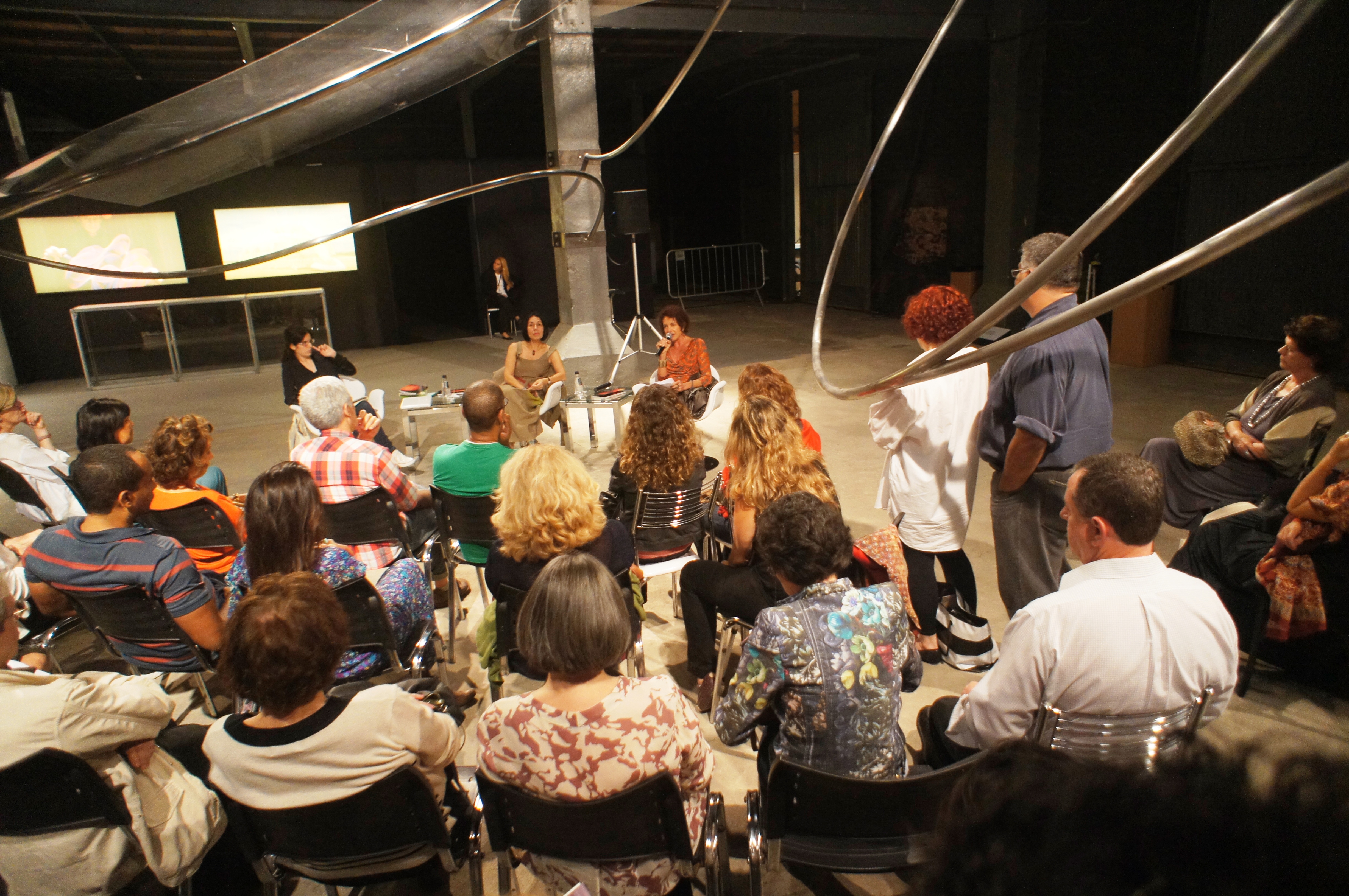 Ilana Strozenberg e Luisa Duarte falam sobre e com a artista Iole de Freitas, cercada por uma de suas esculturas