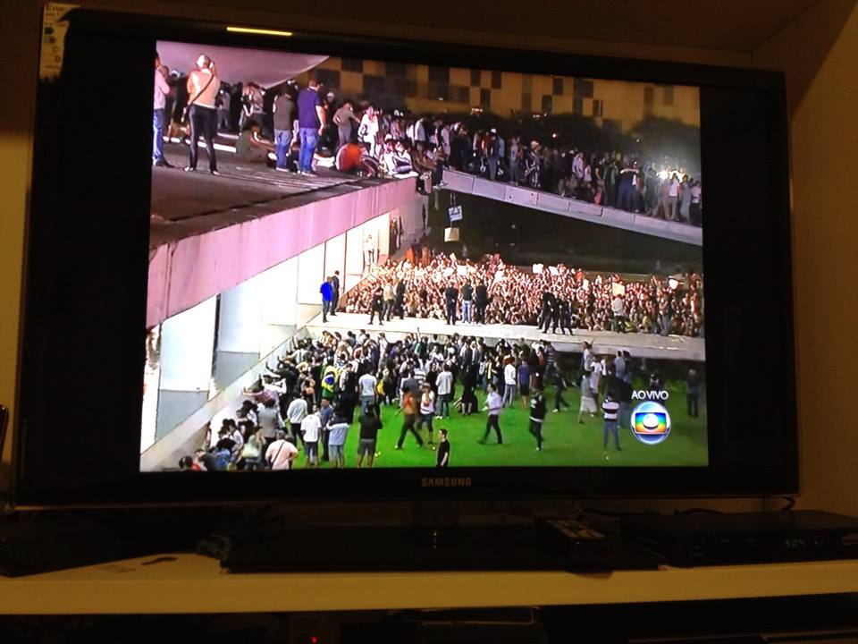 Possibly the demonstration's most dramatic moment: the crowd realizes that protesters in Brasília have invaded the roof of Congress