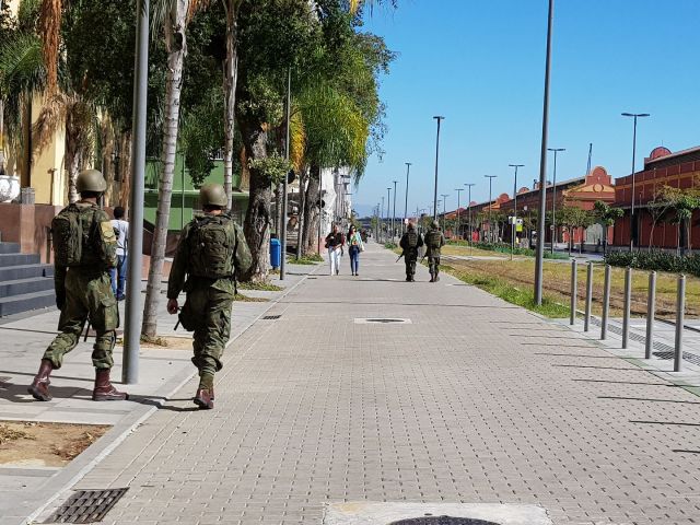 Soldiers patrol the deserted Olympic Boulevard, part of the revitalized Porto Maravilha, on a Monday morning
